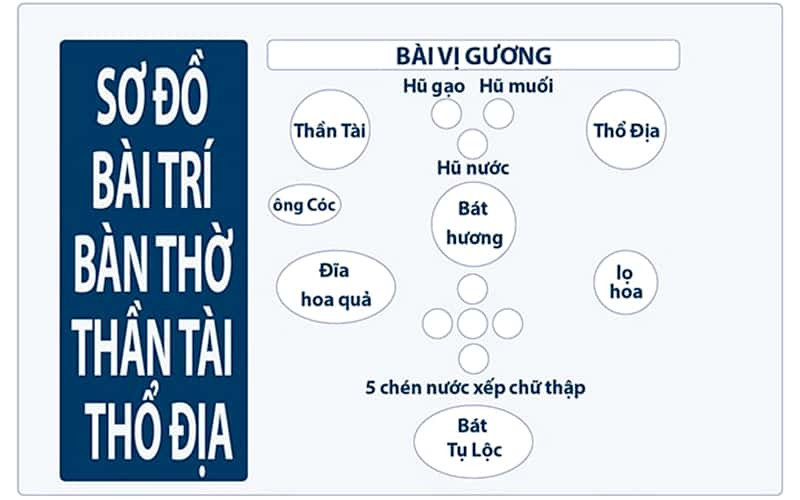 Nguyên tắc bày trí bàn thờ là “trong cao ngoài thấp”, Thần Tài – Thổ Địa ở vị trí cao nhất. Cụ thể:
