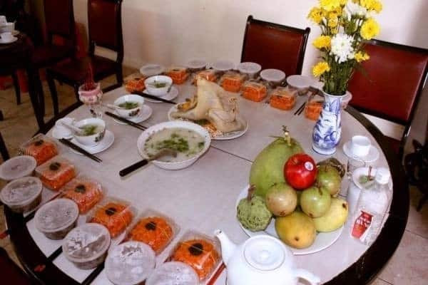 Tùy theo phong tục gia đình mà mâm cúng gia tiên có thể khác nhau, thường bao gồm các món ăn truyền thống, cơm, canh, xôi, gà luộc, hoa quả, hương đèn…